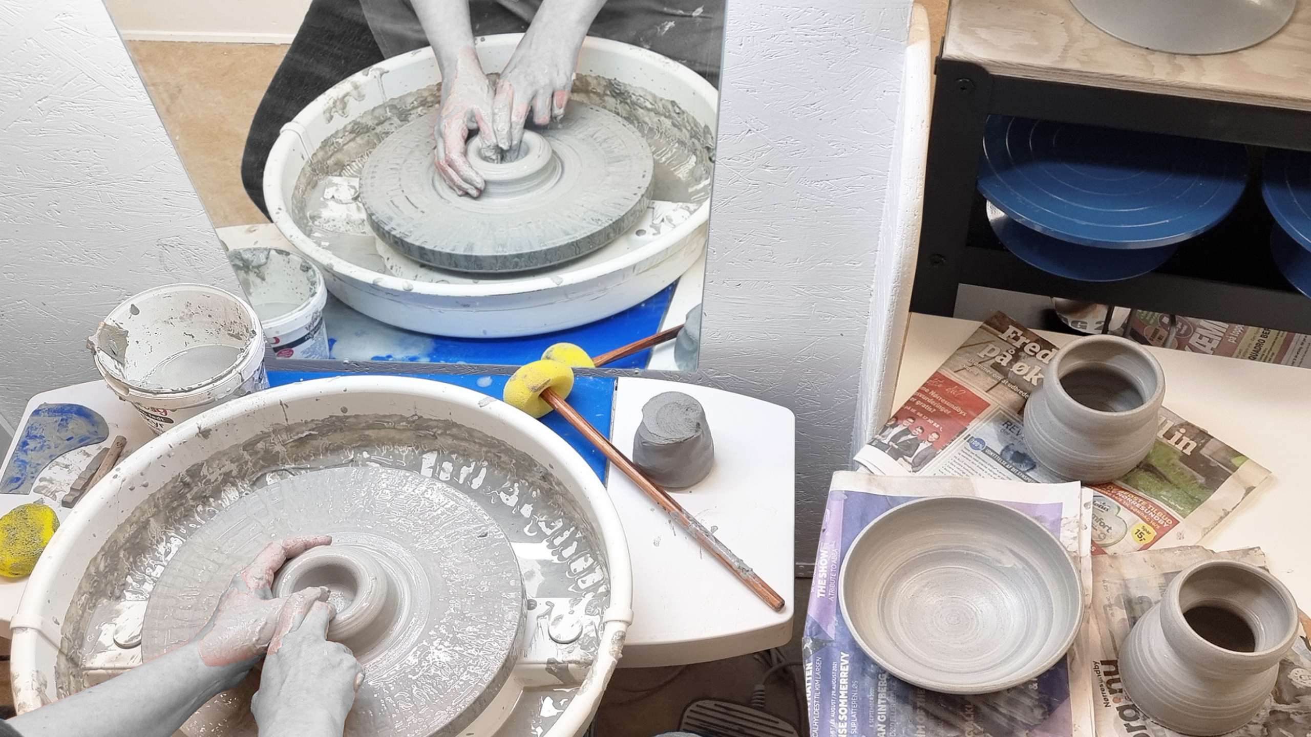 Har du lyst til at lære at dreje, så gør øvelse som bekendt mester, og det er der rig mulighed for på Husets drejeværksted. Der er 5 elektriske drejeskiver med god plads omkring, så du sagtens kan fordybe dig i drejeprocessen.
