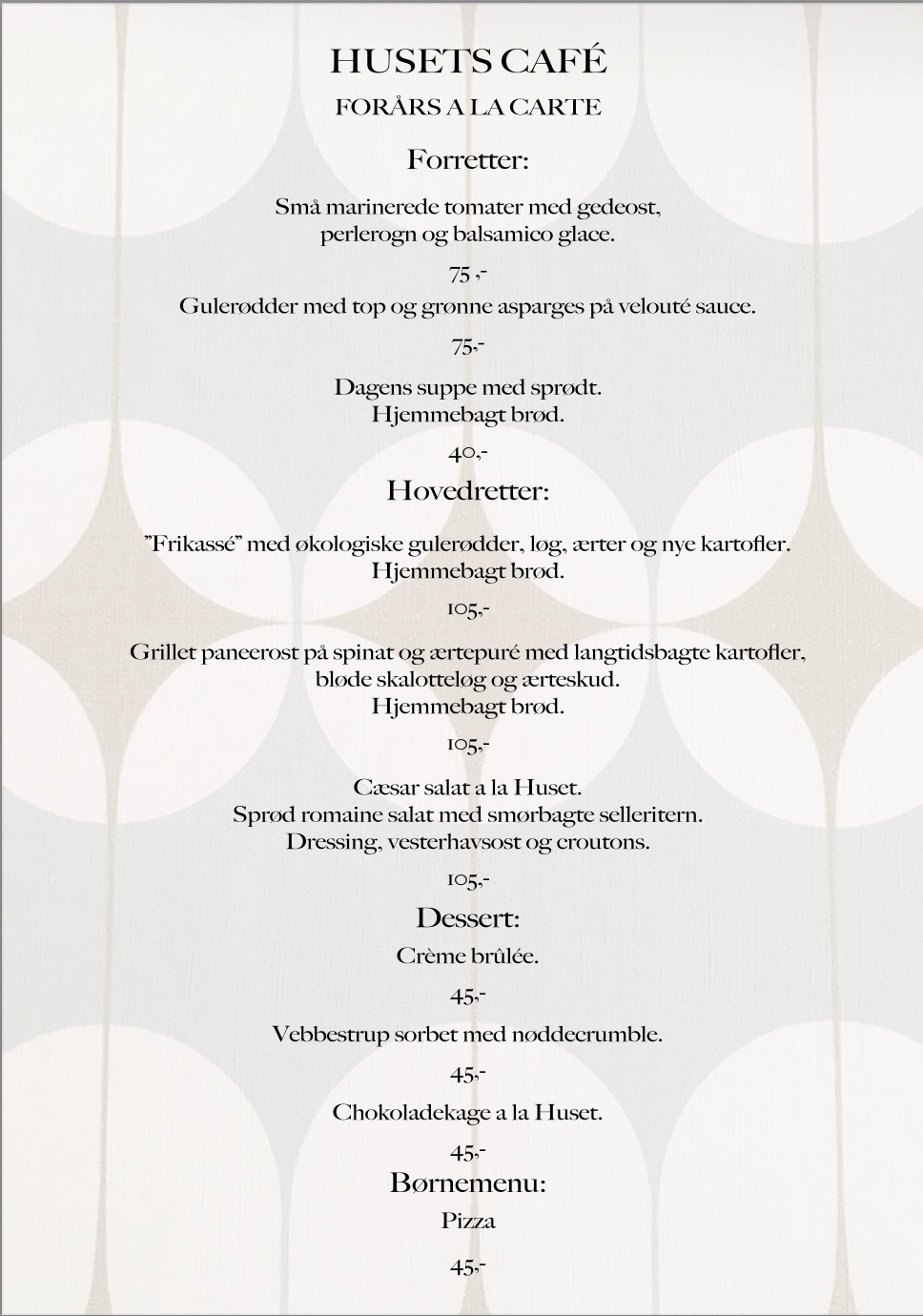 Husets Café er opdelt i to sektioner, vores lille Café, Morgen, Middag og Kaffe der åbner om morgenen og serverer morgenmad og frokost, og vores store Café som åbner Eftermiddag og Aften med vegetariske retter.