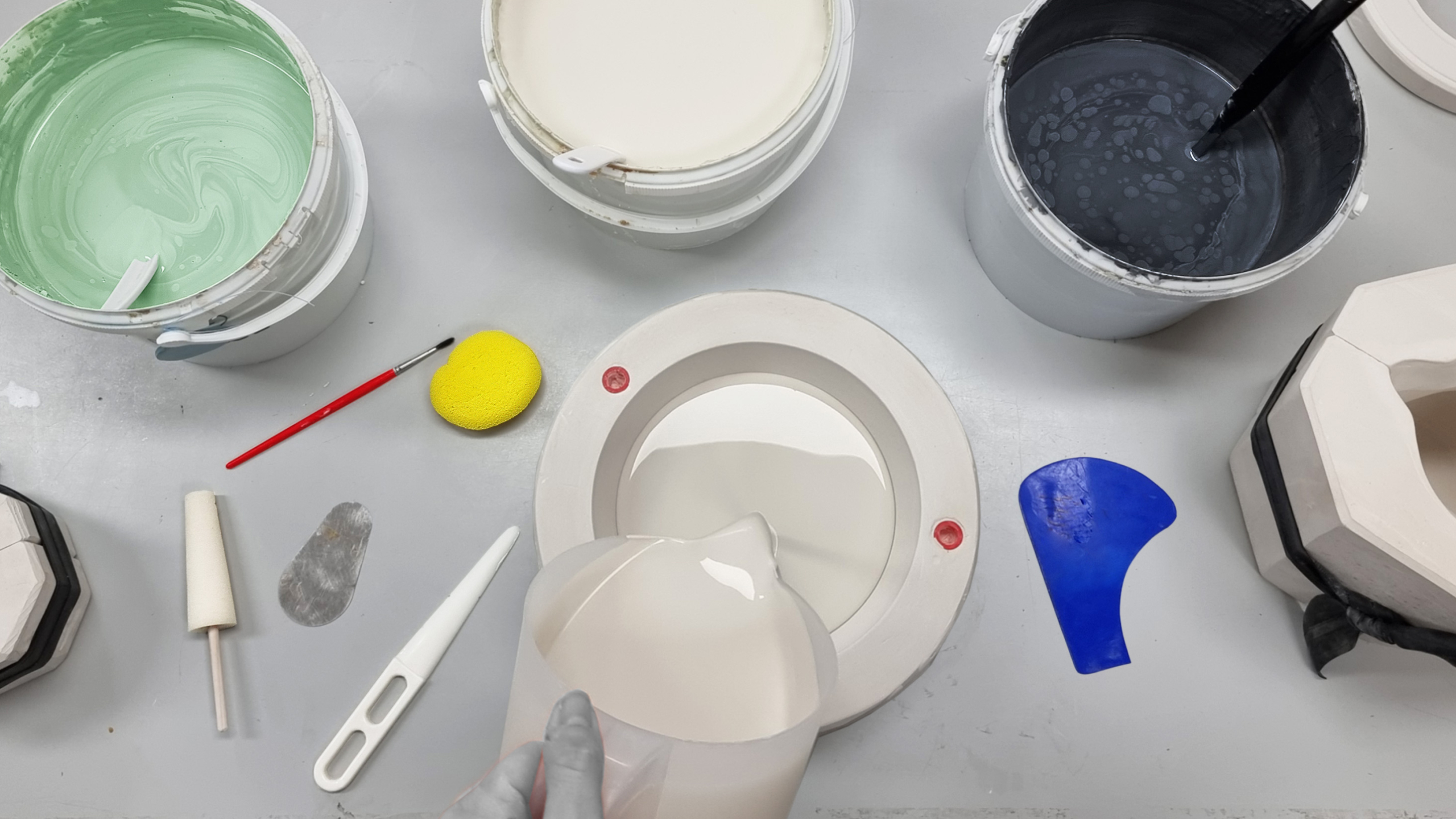 Det flydende ler hældes i gipsforme, hvorved man kan støbe kopper, kander, vaser, tallerkener og meget mere.
