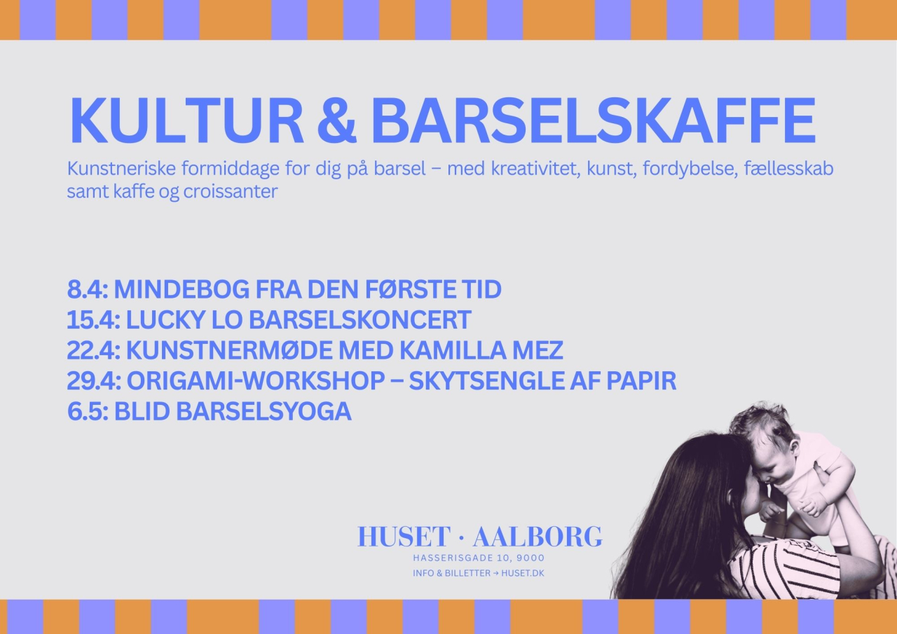 Vi ønsker at skabe et frirum for dig på barsel med kunstnerisk input og mulighed for at møde andre forældre. Hver gang byder på en faciliteret aktivitet – fx kunstworkshop, yoga, koncert eller kreativ fordybelse – efterfulgt af kaffe og croissanter i Husets Café